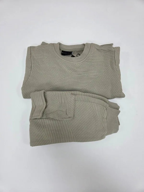 סט שני חלקים הכולל חולצת סריג ומכנסיים תואמים, המעוצב בקו נקי ומודרני עם טקסטורת פסים גיאומרית שנותנת טאץ' יוקרתי למראה הקז'ואל.