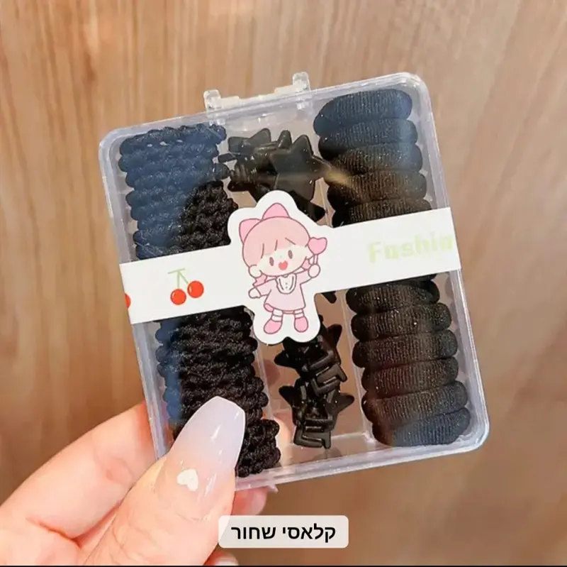 המארז כולל גומיות שיער חזקות מבד טריקו לאחיזה יציבה, לצד אטבים קטנים ומקסימים בצורת כוכב להוספת נגיעה שובבה ומוקפדת לקצוות השיער או לשיער הקדמי.